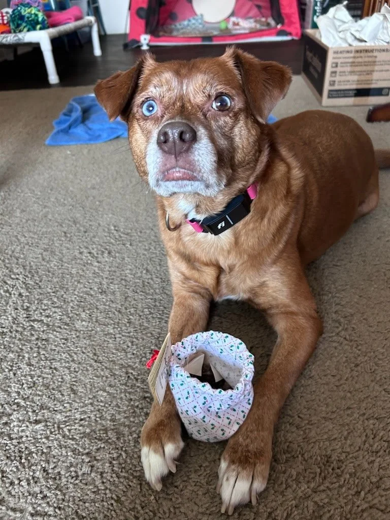 There are people in this box? COOL! Hello box peoples! I have been with my Dearest Humans since, well, forever I guess. They are pretty great. They let me sleep on them and lick them a bunch and they even brought me a kitty. I didn't know I needed a kitty. But Kitty said I did. So I'm glad he is here. Kitty likes to make lots of plans but I am more of a "go with the nap" kinda girl. I do enjoy a nice game of fetch and a walk but besides that I'm all about that nappy snuggly life!